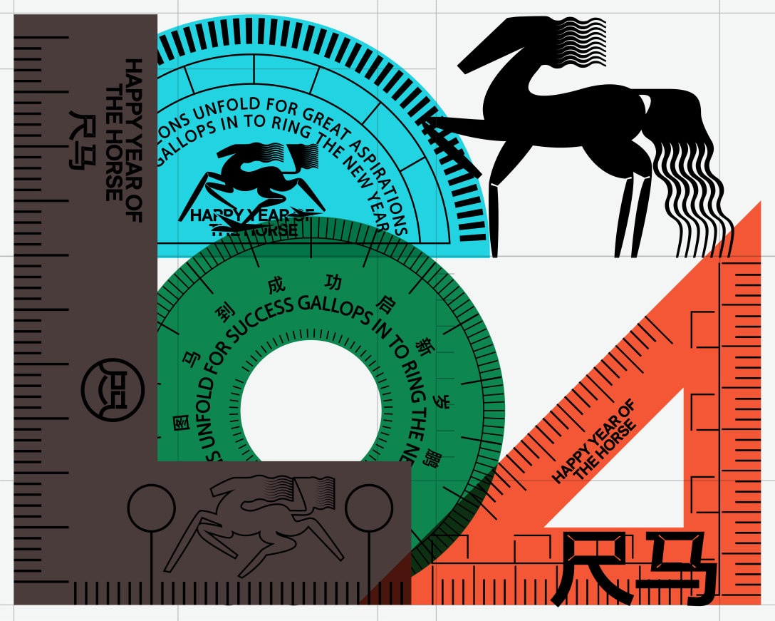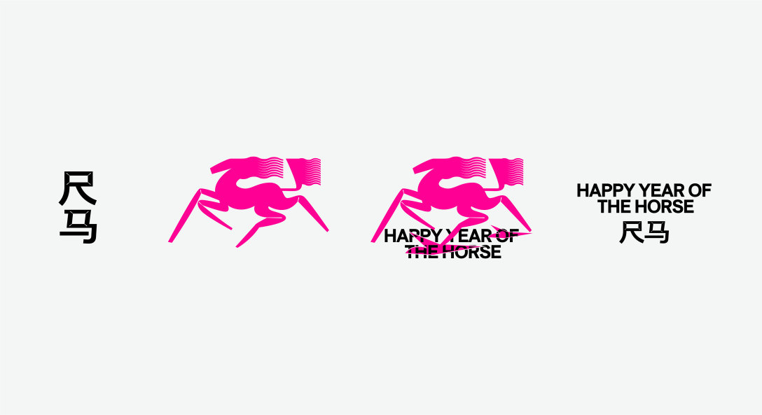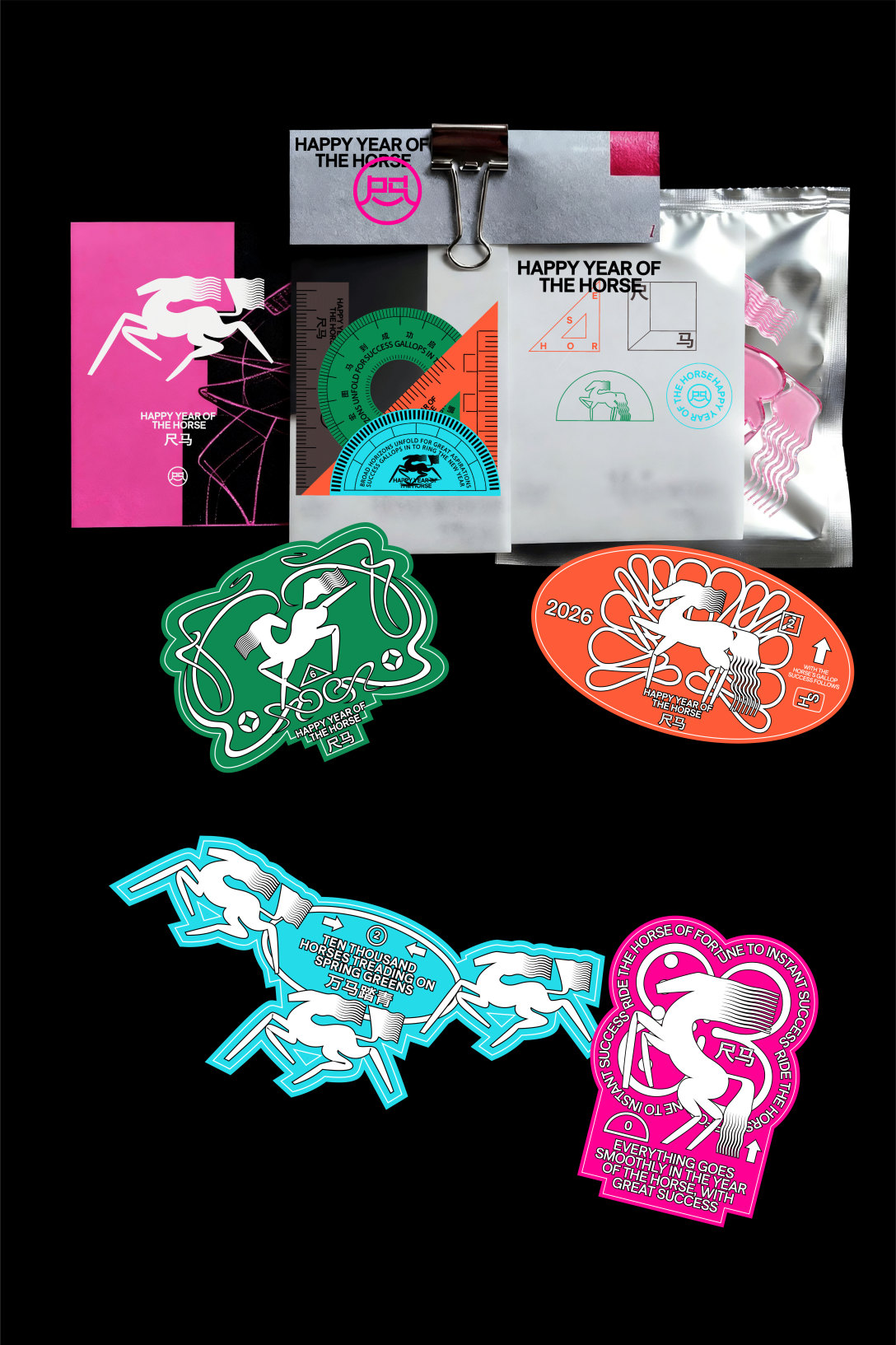 以“几何马形”为核心符号,将传统生肖马解构为简洁锐利的线条造型,跳出传统生肖的厚重感,用高饱和撞色(玫粉、青蓝、荧光绿)锚定年轻潮流调性-既保留“马”的动感辨识度,又通过符号化设计让生肖元素成为可复用的视觉基因(贯穿纸袋、贴纸、礼盒等全物料),实现“传统生肖的现代潮改”,让马年符号从“节日装饰”变成年轻群体愿意主动传播的视觉标识。