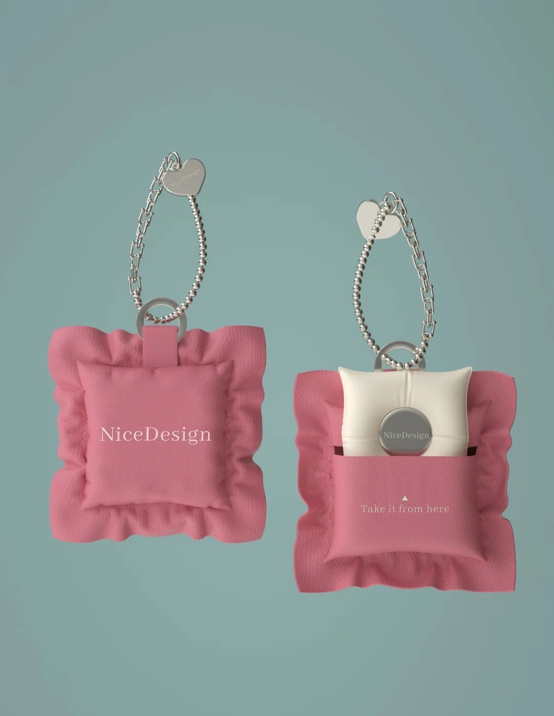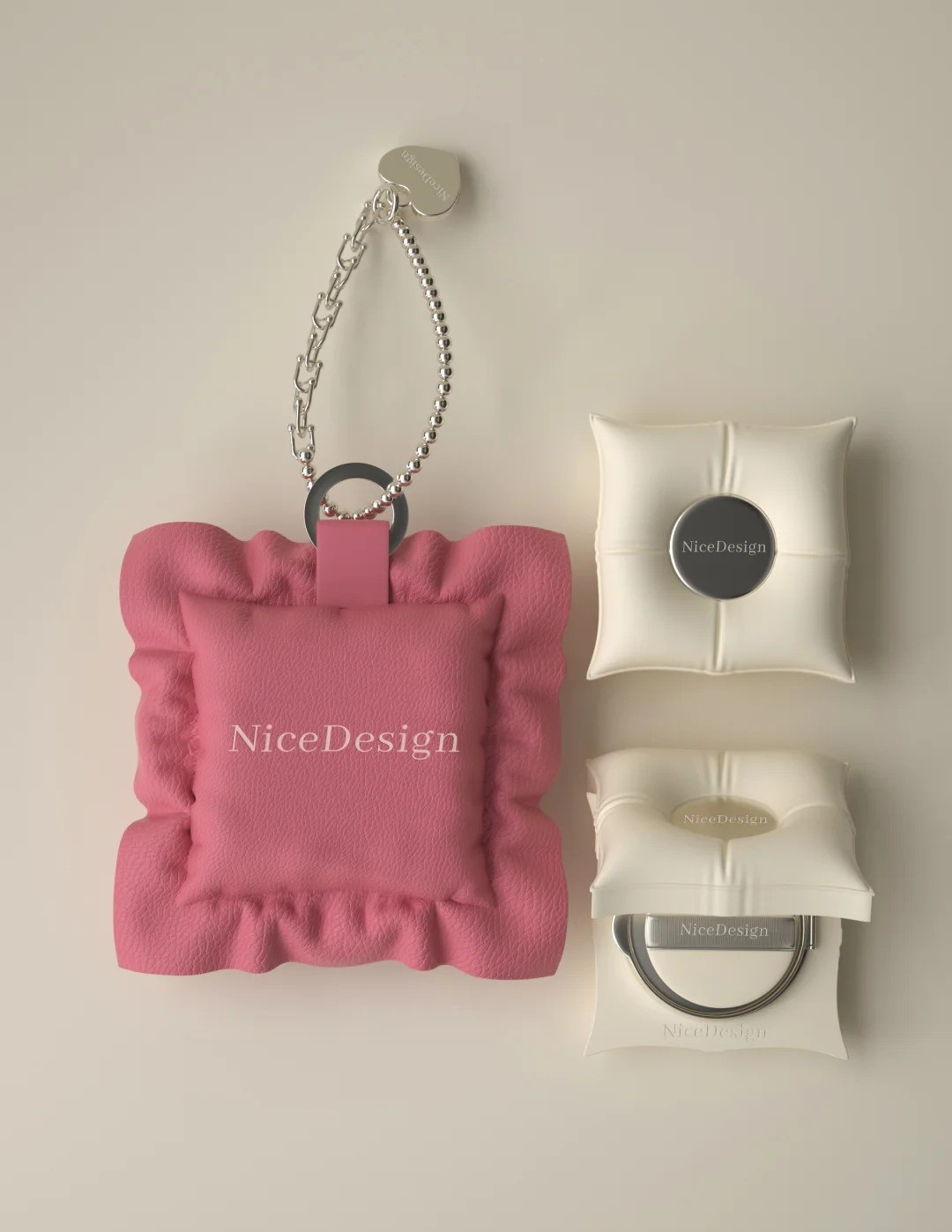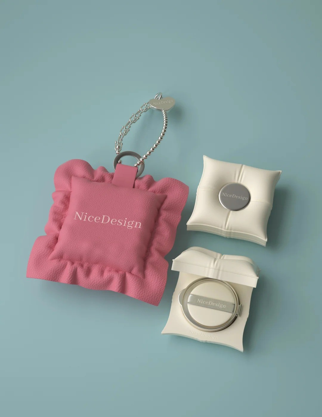 设计灵感来源于气垫与枕间相近的柔软意向 打破彩妆气垫顶部较为平面的印象 赋予产品一种可触摸的温暖与亲密 方形枕芯造型的气垫 模拟了枕头的饱满与回弹感 盖面中央嵌入刻印logo的金属圆片 刻意保留金属挤压下皮面形成的自然褶皱 金属链条既是装饰 亦赋予产品可手提、可悬挂的灵活性 上妆的片刻成为与自己温柔相待的仪式 如家居织物一般是一次轻柔的拥抱时刻