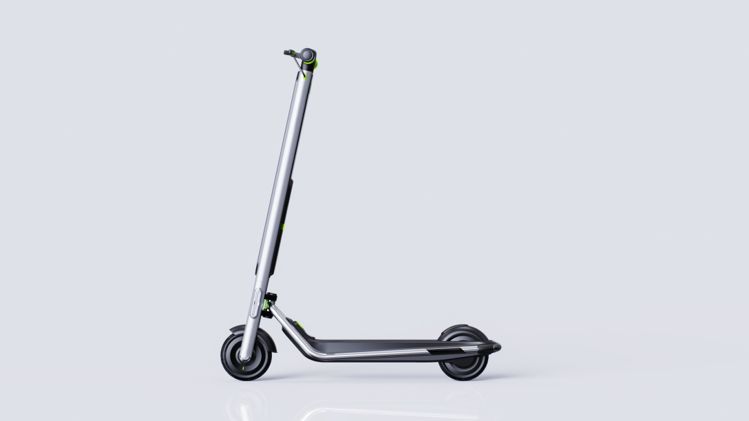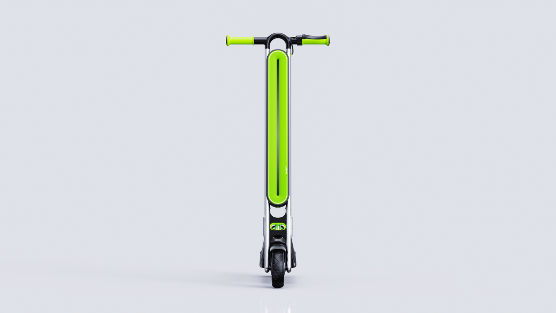 设计说明:把上醒目的亮绿色把手套,是第一眼的视觉焦点。表面精心设计的菱形防滑纹理,在提供稳固握持感、确保安全的同时,赋予了产品极高的辨识度。 银灰色流线型车身构成了产品的主基调,金属质感搭配简洁线条,传递出冷静、高效的现代科技感。 所有的操控逻辑都集中于车把区域。符合手指自然弧度的刹车手柄与集成式控制开关,布局清晰、触手可及,确保用户在行驶中能实现直观、快速的指令操作,将复杂的科技简化为一步到位的从容掌控。