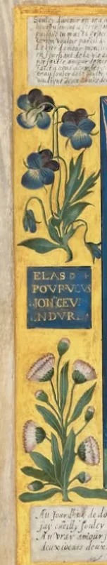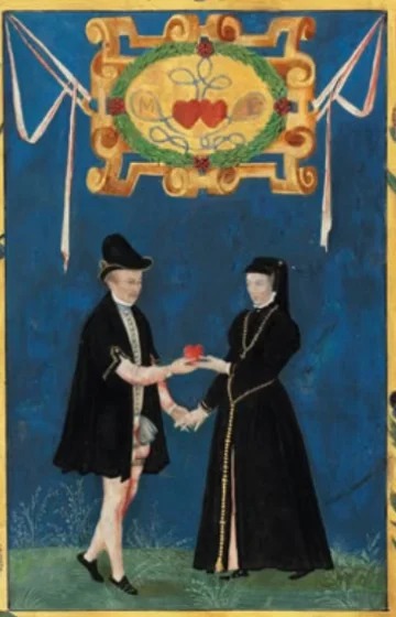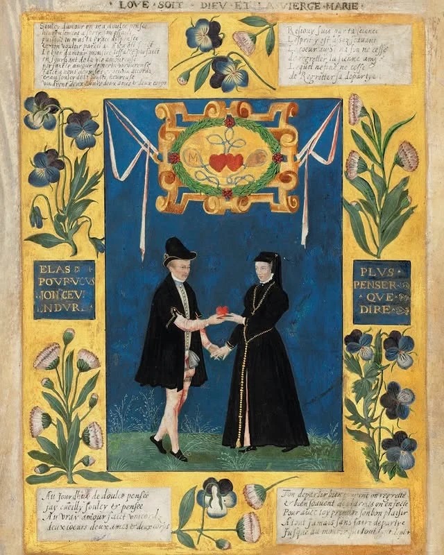 “一幅描绘一男一女全身像的微型画,他们手捧一颗心,下方饰有两颗心以爱情结相连的涡卷纹章,四周环绕着三色堇(象征思念)和雏菊(可能代表玛格丽特的名字)的边框……”——佳士得拍卖行。