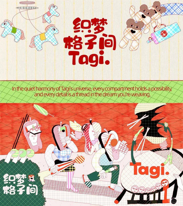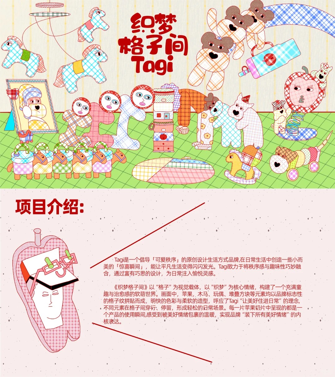 将热闹的欢聚时刻、天马行空的创作瞬间等日常,装进苹果切片这一视觉结构里,串联成一场想象力流动的生活秀场……怪诞与抽象的表达;明快的色彩与柔软的造型;让怪诞感与治愈感奇妙相融,即抽象变形的人物带着俏皮的张力,软萌的玩偶又传递着安心的温度,精准呼应了Tagi“让美好住进日常”的品牌理念。通过怪诞又治愈的视觉呈现形式,将Tagi.“让想象随时发生和装下美好情绪”的品牌理念,在日常场景中自然流淌。