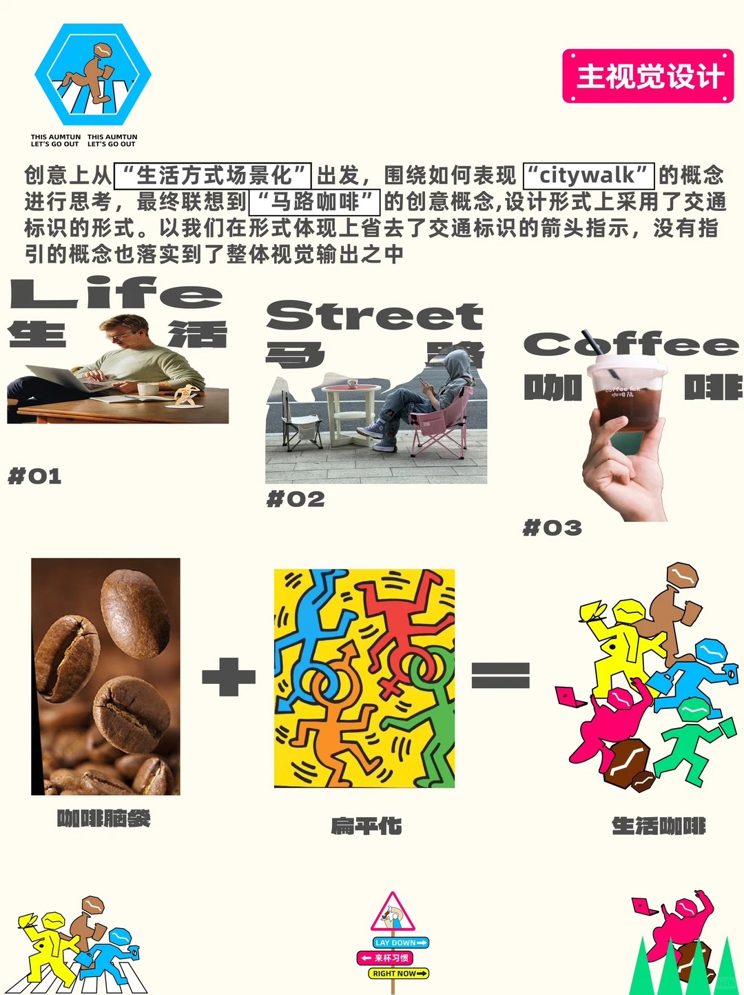 视觉从生活方式场景化出发,联想到马路咖啡的创意概念,用了一些原始的波谱设计风格来构建主视觉 字体更多一些基础变形也是从轻松,简约两个关键词去构建,以及融入超级咖啡豆的设计符号