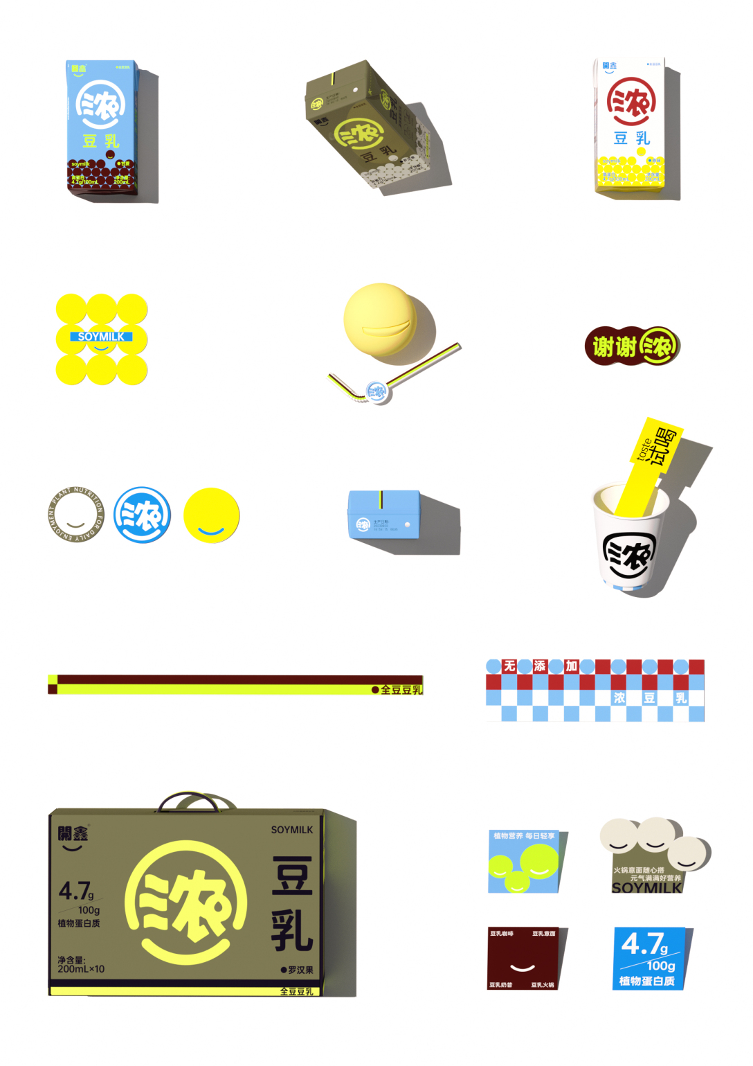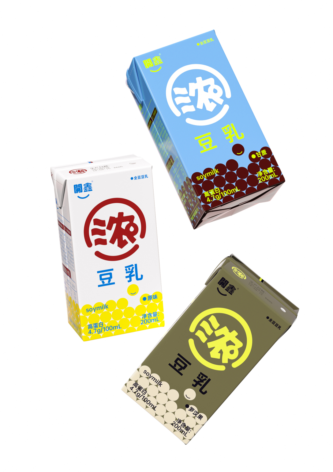 “浓”的图形从品牌logo“開鑫”的笑脸符号中提炼出来,结合浓豆奶的象形水滴同构而成。既保留品牌性同时具有象形识别。超级符号在包装正面最大化,品牌卖点最大化呈现,提升了产品的货架优势和阵列感,与同类产品做出显著区分,无论是线下终端货架还是新媒体都能一眼被发现,让包装自己完成销售。
