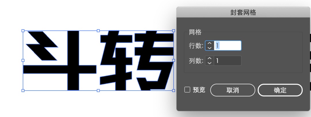 ② 选中第一组文字,在顶部菜单栏中选择对象-封套扭曲-用网格建立,然后在弹出的参数面板中把网格行数和列数全部设置为1。