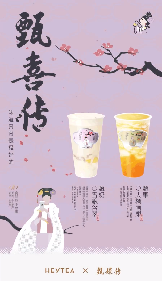 又比如喜茶和《甄嬛传》系列联名,推出「甄果·大橘画梨」和「甄奶·雪酿含翠」二款联名饮品,还有多款联名限定周边。从贴纸、手袋都是中式人物形象,增加了品牌的中式文化氛围。