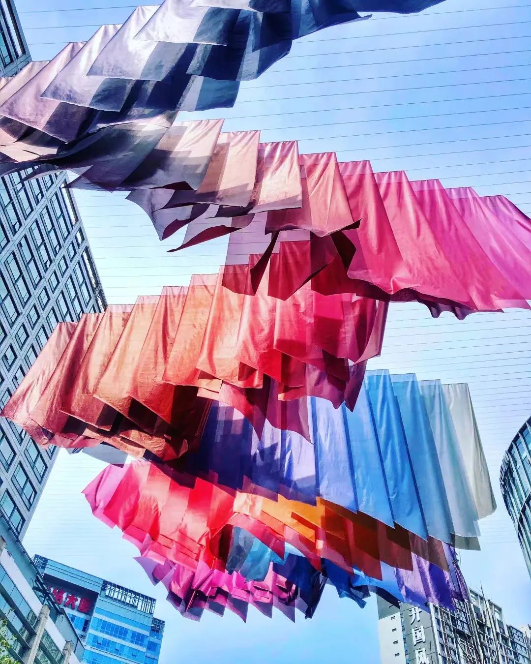 焕然新生的望京小街拥有多个艺术气息浓郁的网红打卡点,而其中人气最高的当属装点小街天空的“天幕”了,这件公共艺术作品完美地诠释了望京小街的艺术时尚氛围,为每一个来到小街的人撑起了一片美妙的灿烂穹顶。