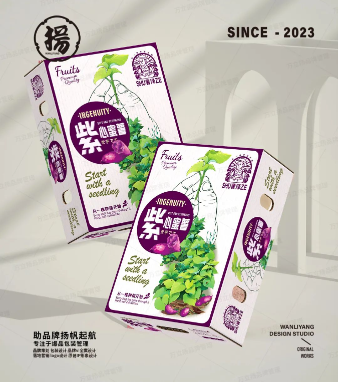 整体是紫绿两种颜色,紫色与紫薯颜色相呼应,绿色则与种苗颜色呼应,背景是一只手绘线条之手握着种苗,突出了品牌的理念—从一株种苗开始,用心产出每一个高品质产品,中间的文字大小错落有致,突出了“紫”这一关键字,让人一眼就看到。