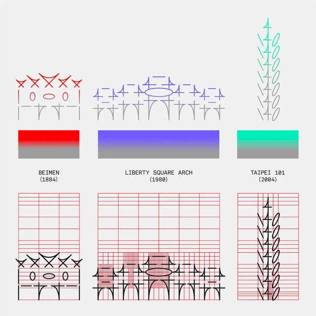 设计以数字1、4、0为核心元素,巧妙地勾勒出台北建城起点北门的形象,同样元素也将用于描绘不同时代台北的标志性建筑,生动展现自建城以来140年间,台北城市风貌在变与不变中交织出的独特韵味。