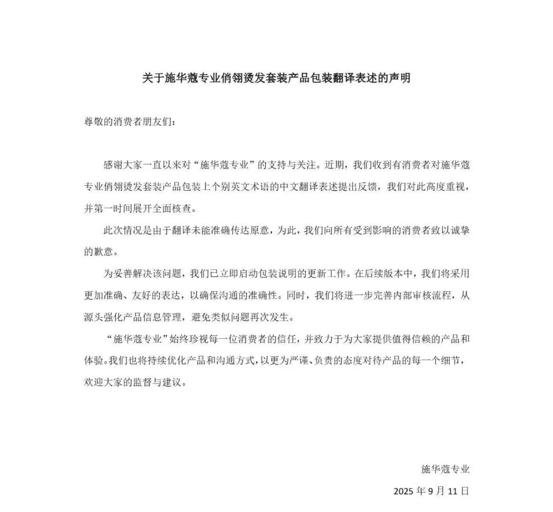 舆论发酵之后施华蔻方面发布道歉声明称:已经立即启动包装说明的更新工作,并将完善内部审核流程,避免类似问题再次发生!