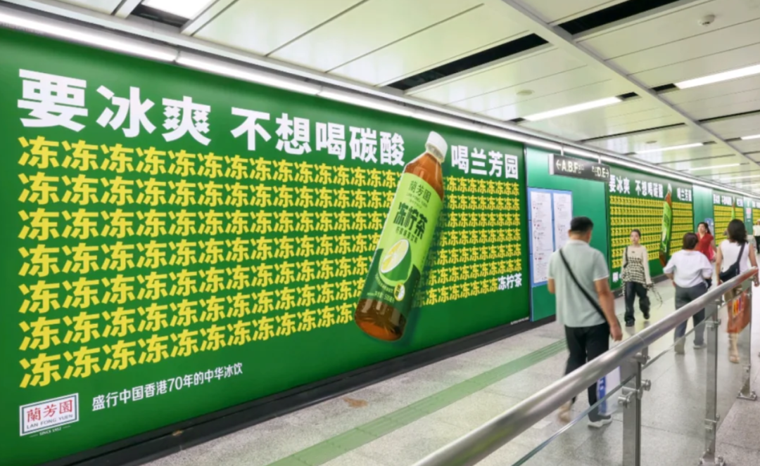 这边 “鲜” 字还没从脑子里删掉,那边兰芳园的 “冻” 字广告又来 “洗脑”。黄绿配色魔性到不行,整个画面全是 “冻冻冻冻冻”,密恐人士看了直呼顶不住,就算不是密恐,盯久了也感觉字在眼前打转。