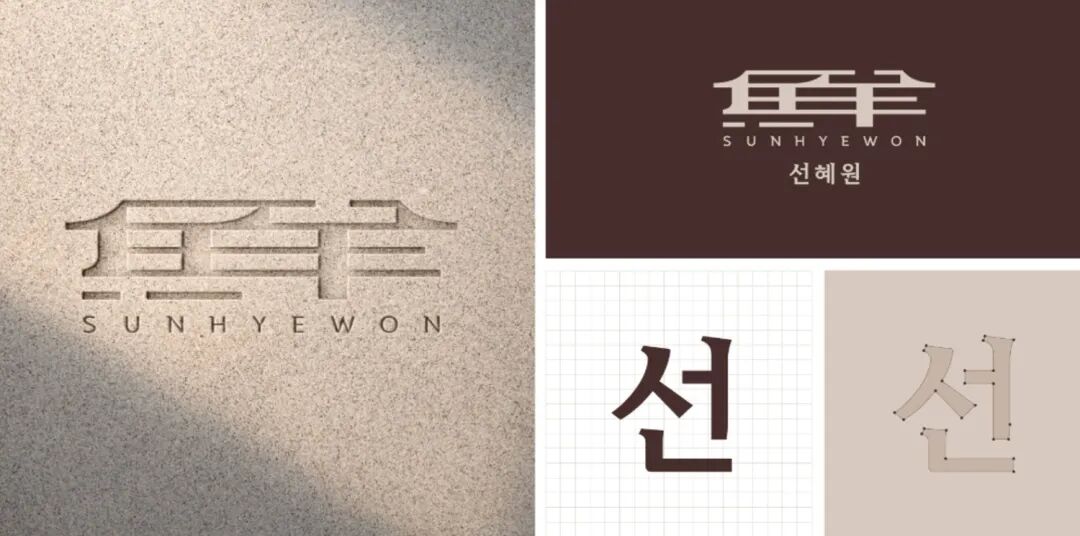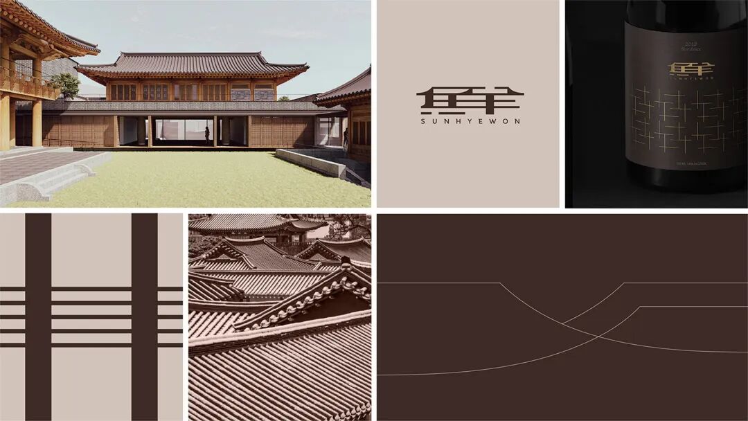 标识融合了弧形瓦片和笔直的木柱,象征着传统与现代的和谐统一,而图形图案则以精致的线性重复重新诠释了韩屋的形态。