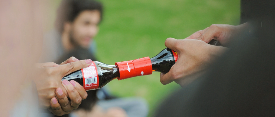你必须找到另一个拿着同样可乐瓶的人,把两个瓶盖的顶部像齿轮一样“咔哒”一声扣在一起,然后反向一拧,两瓶可乐就能同时被打开。