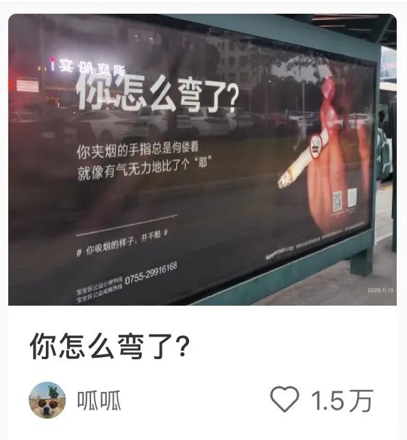 最近深圳宝安区一则禁烟广告,把打工人的CPU干烧了——“你怎么弯了?” 刚刷到这四个字时,网友集体瞳孔地震:“现在公益广告都这么敢聊了?”