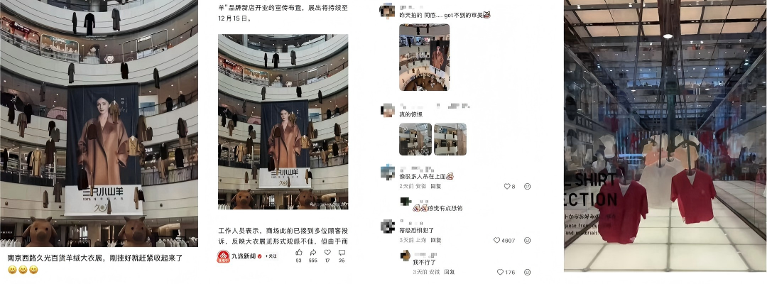 最近,在上海南京路的静安久光百货的中庭挂了一堆大衣,离远看像一个个“无头尸体”天上飘。原来是杨幂的新代言,三只小山羊设置的宣传广告。