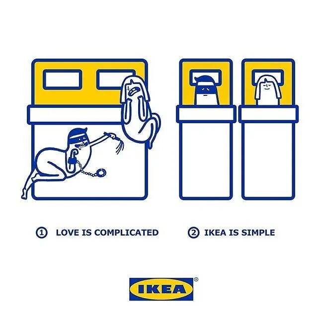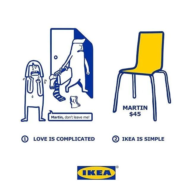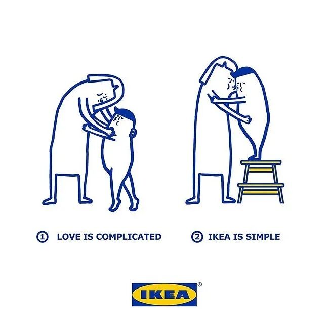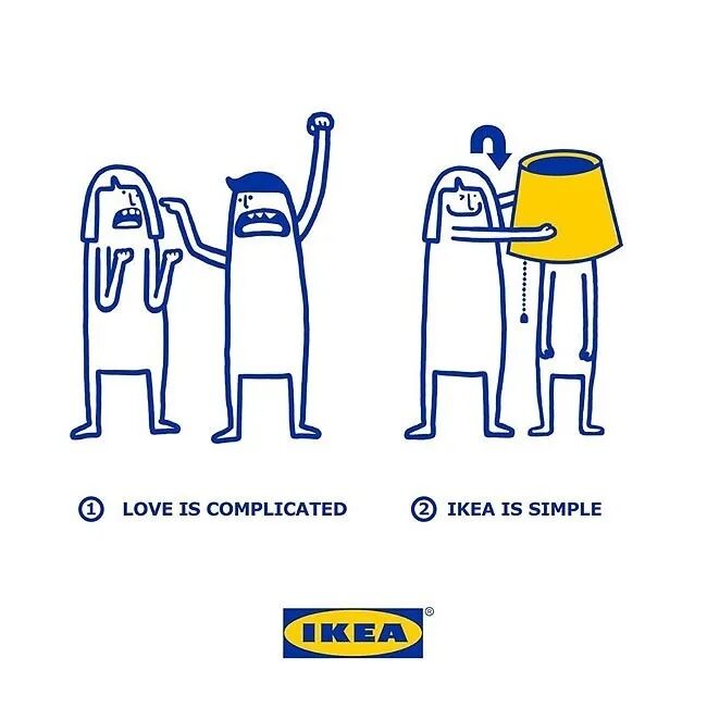 文案丝毫不拖泥带水,画龙点睛:爱情是复杂的,而宜家是简单的。Love is complicated,IKEA is simple。